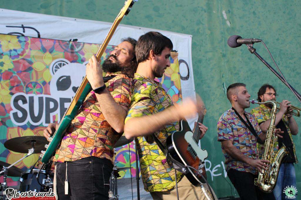 Eso son, y eso transmitieron. Diversión, color y desenfado, y además calidad técnica, pues en Superacid se concentran varios músicos con no poca experiencia en la escena navarra. La sección rítmica está dirigida por Aitor Omenal “Home”, exbatería de bandas como Vice Presidentes o Silencio Absoluto, además de haber grabado varios discos con Sorkun. ¿Quién hubiera dicho que apenas lleva dos meses embarcado en Superacid? Mientras Pablo, al bajo, pone la armonía, como también hace en No More Blues, banda referente de la música negra en Pamplona-Iruña, Diego, a la guitarra y voz, que viene de tocar en Inconexa y Bloken, es quien transmite la idea festiva del grupo, que no está reñida con el librepensamiento y la crítica social.