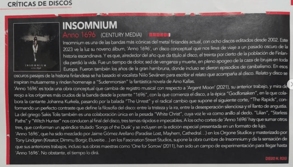 Imsomnium es una de las bandas actuales más icónicas del metal finlandés, con ocho discos editados desde el 2002. Este 2023 ve la luz su noveno disco, “Anno 1696”, un disco conceptual que nos lleva de viaje a un pasado oscuro de la historia escandinava. Y es que, alrededor del año que da título al disco, el 30% de la población de Finlandia fue asesinada. Fue un tiempo de dolor, sed de venganza y muerte, en pleno apogeo de la caza de brujas en toda Europa. Fueron también los años de la gran hambruna, donde incluso se dieron episodios de canibalismo. En esos oscuros pasajes de la historia finlandesa se ha basado el vocalista Niilo Sevänen para escribir el relato que acompaña al disco. Relato y disco, se inspiran a su vez y rinden homenaje a “Sudenmorsian” la fantástica novela de Aino Kallas. “Anno 1696” es toda una obra conceptual, que cambia de registro musical con respecto a “Argent Moon” (2021), su anterior trabajo, y mira de reojo a los orígenes más crudos de la banda. Desde la potente “1696” con la que comienza el disco, a la épica “Godforsaken”, en la que colabora la cantante Johanna Kurkela, pasando por la balada “The Unrest”, con el radical cambio que supone el siguiente corte, “The Rapids”, es un perfecto contraste que define la filosofía del disco: entre la tristeza y la ira, entre la desesperación silenciosa y el llanto de angustia. El griego Sakis Tolis también es una colaboración única en la pesada “White Christ”, cuya voz le va como anillo al dedo. “Lilian”, “Starless Paths” y “Witch Hunter” forman el ecuador del disco, tres temas rápidos e impecables. A los ocho cortes de “Anno 1696” hay que sumar otros tres, “Songs of the Dusk, que se incluyen en la edición especial presentada en un formato de lujo. “Anno 1696”, que ha sido mezclado por Jaime Gomez Arellano (Paradise Lost, Mayhem, Cathedral…) en los Orgone Studios y masterizado por Tony Lindgren en los Fascination Street Studios (Kreator, Dimmu Borgir, Eluveitie…), supone la obra cumbre de Imsomnium, y da la sensación de que sus anteriores trabajos, incluso sus obras maestras como “One for Sorrow” (2011), han sido un campo de experimentación para llegar hasta “Anno 1696”. No obstante, el tiempo lo dirá.